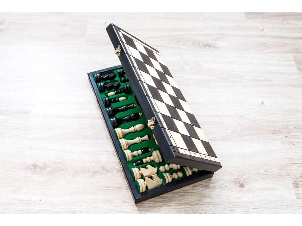 Különböző sakkversenyeken használható sakk-készlet. Könnyen tárolható, a figurák a sakktáblában találhatók.