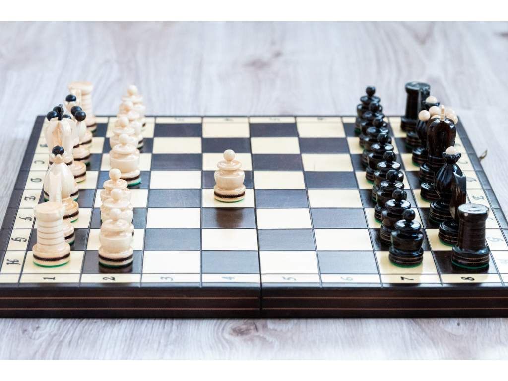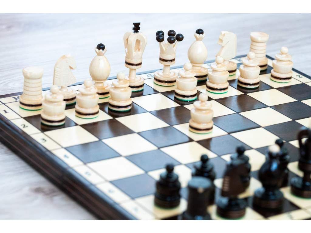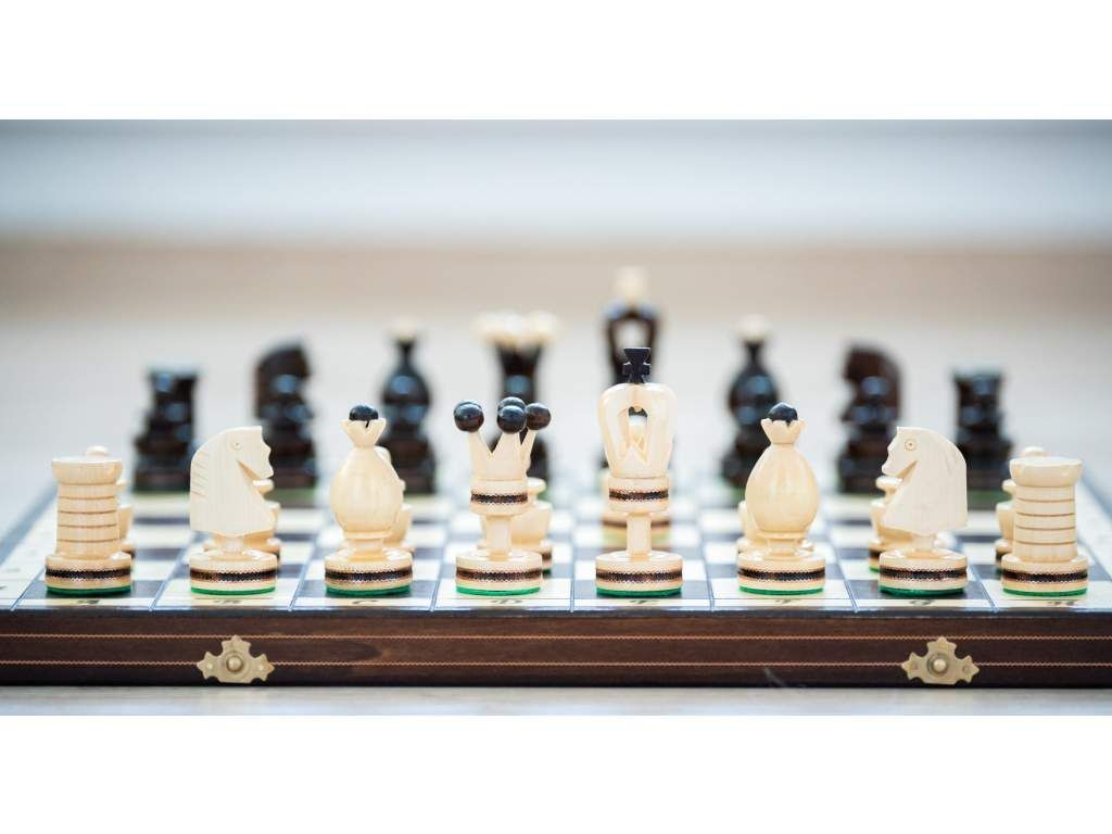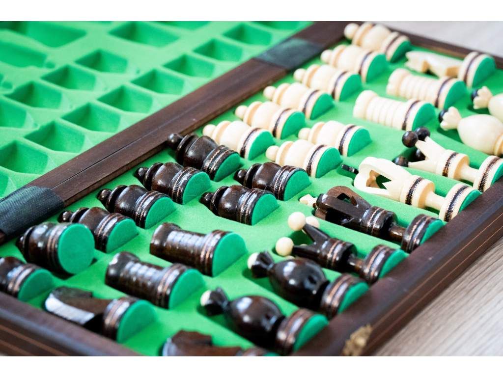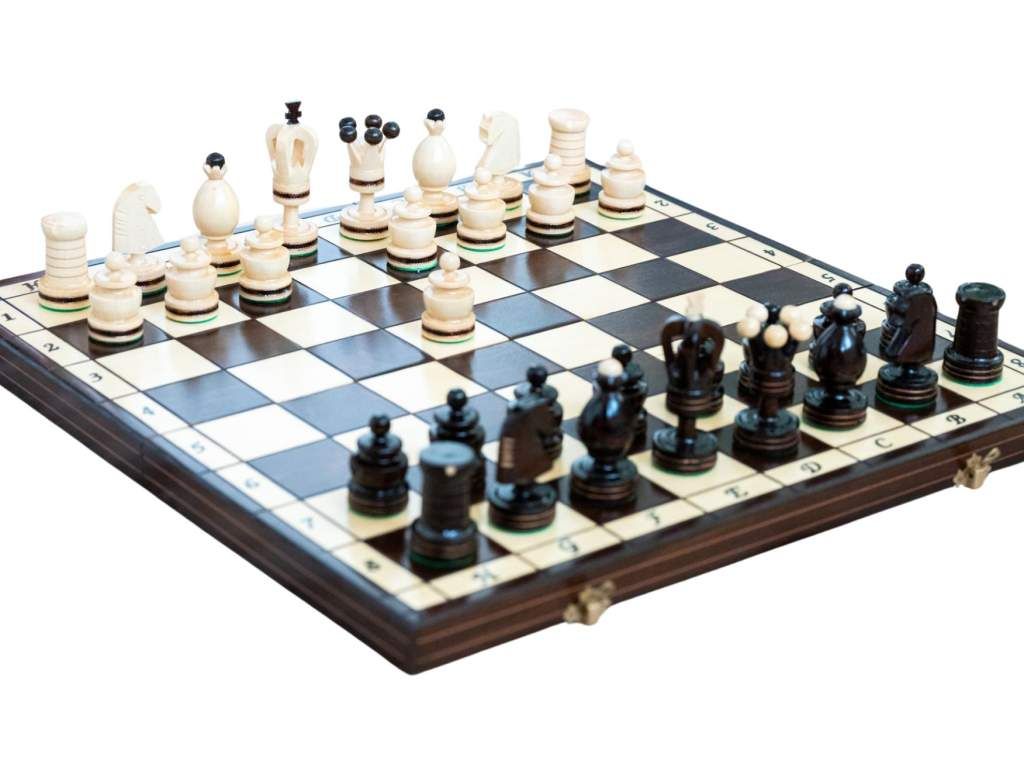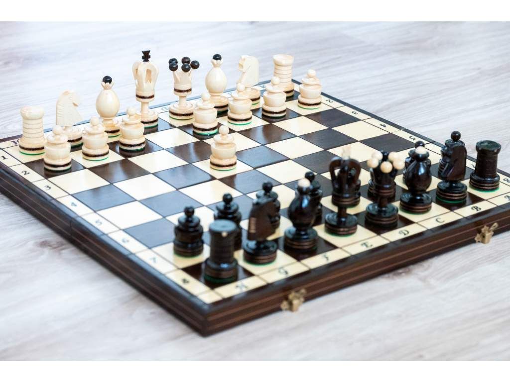 Ajándékba és otthoni játékra alkalmas fa sakk-készlet.
