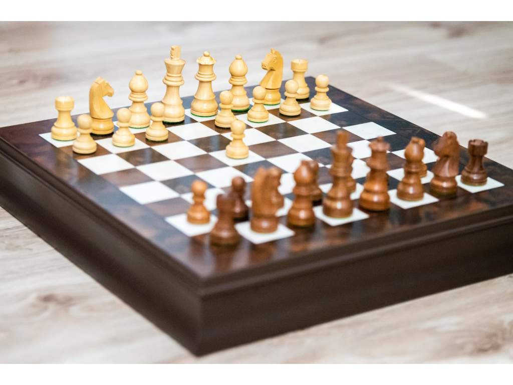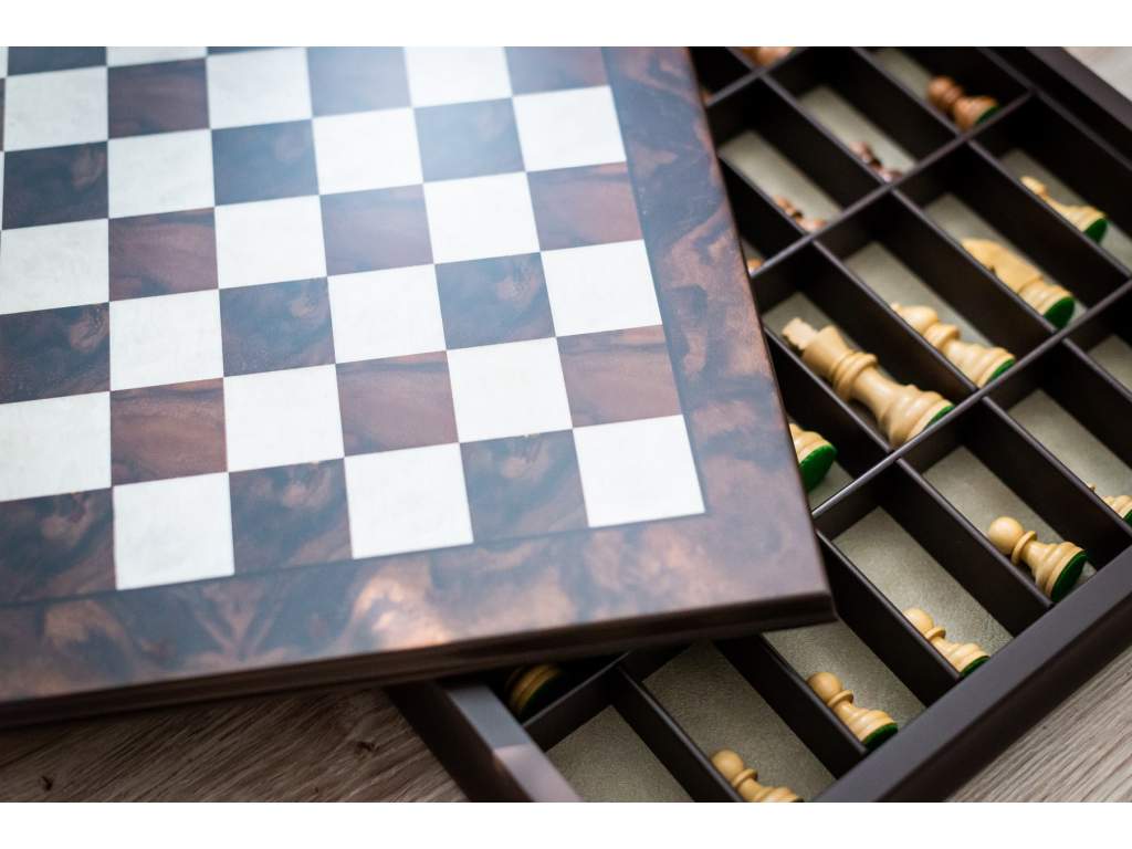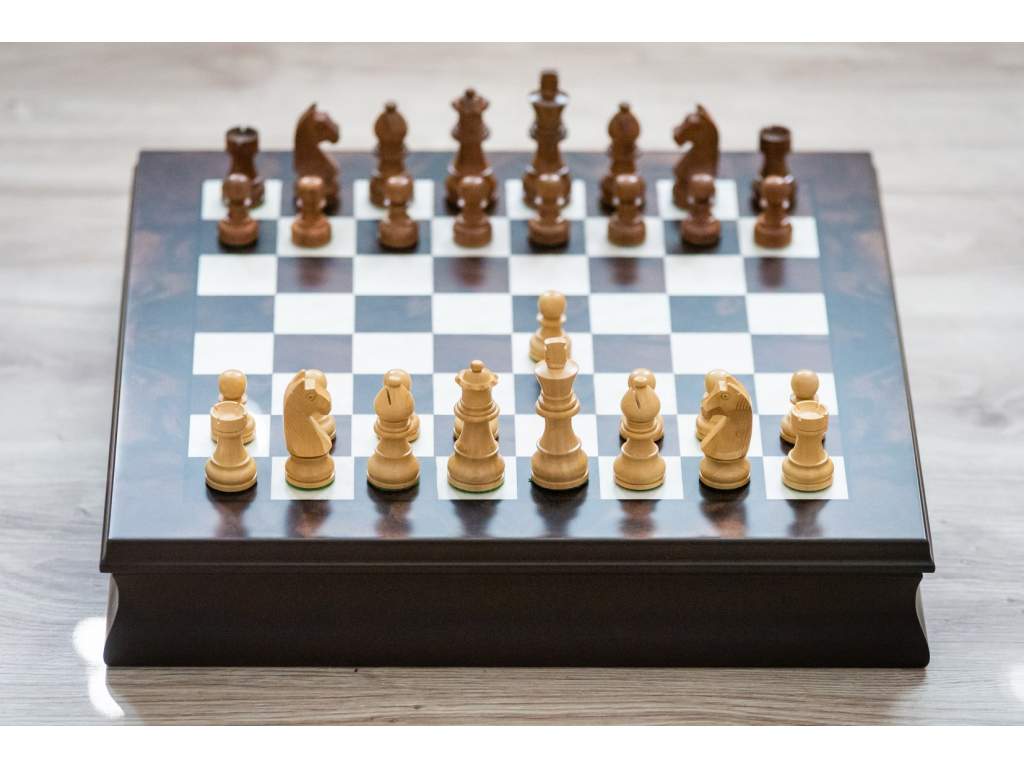 A sakktábla két részből áll (sakktábla + sakkfigura tárolóhely)