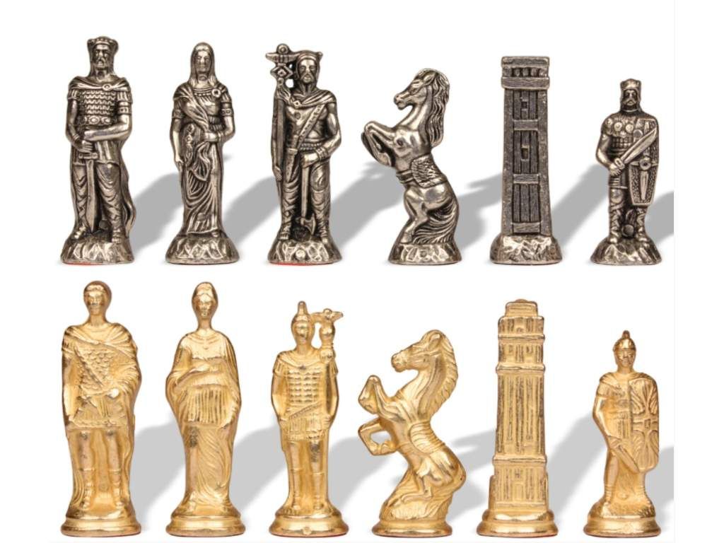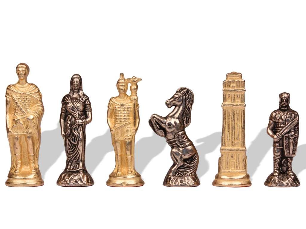 Rézből, nikkelből és öntött cinkből készült sakkfigurák. A figurák talapzata fából készült.