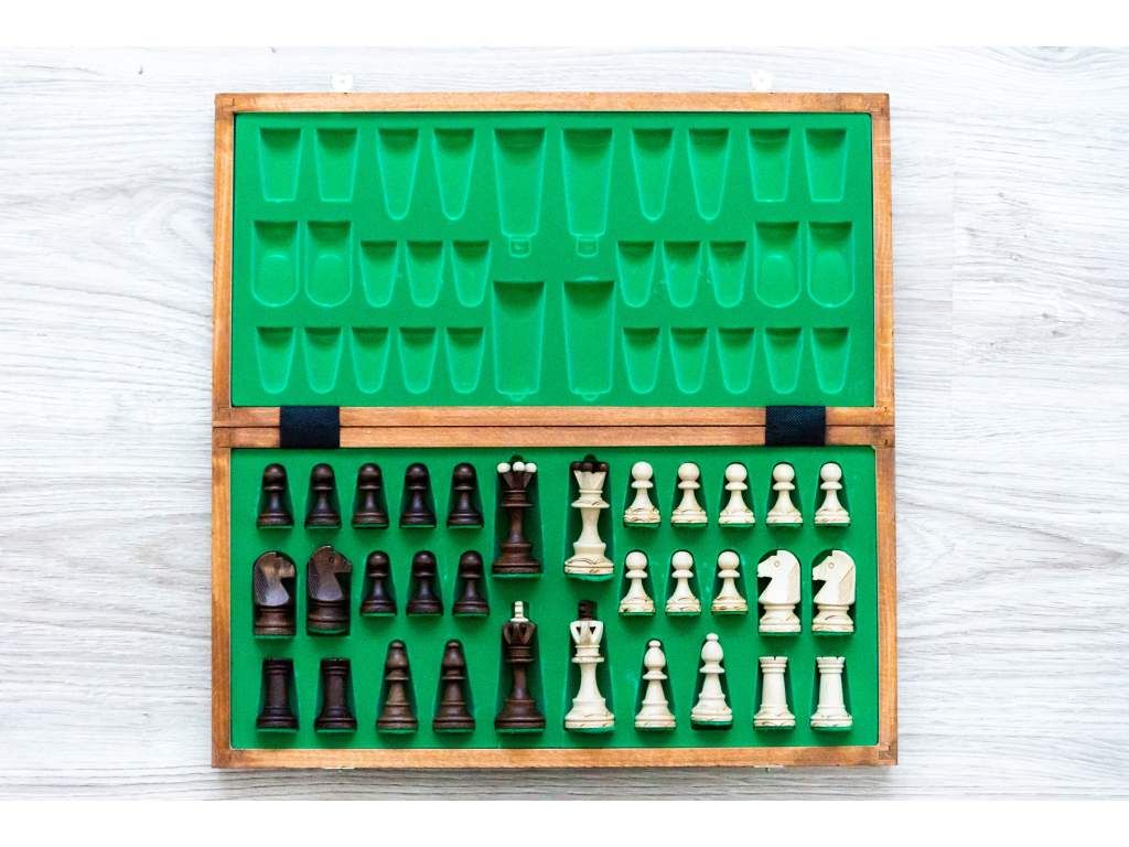 Folding wooden chess set with pieces featuring decorative bases