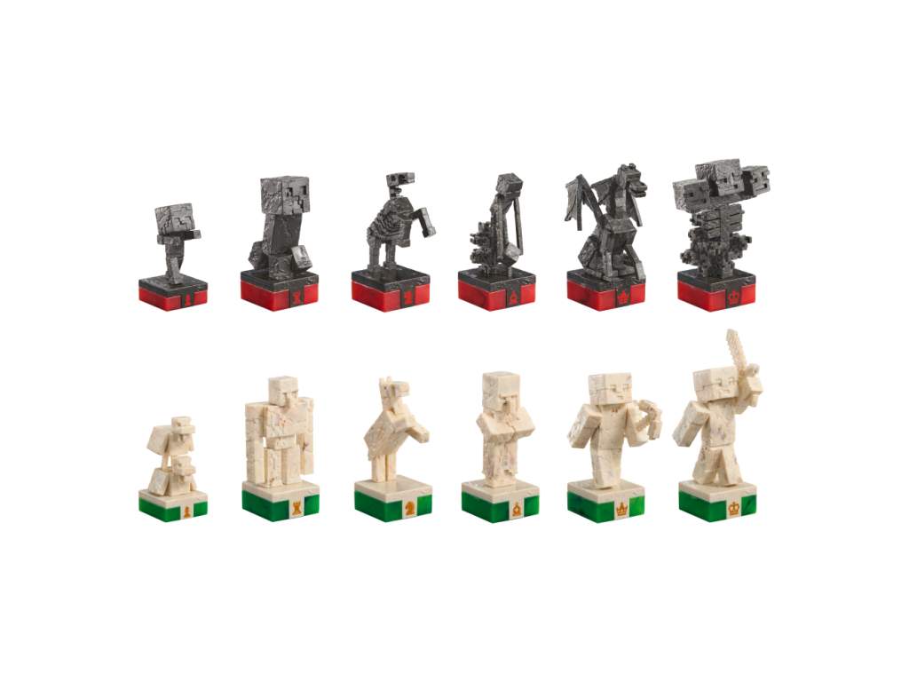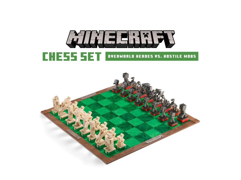 - A 18″ x 18″-es sakktábla a táblát körülvevő fakeret zöld árnyalatú "fű" textúrájú, fémes kivitelű Minecraft logókkal körülvett, királyok (és sztíviák) játékára alkalmas sakktábla.
